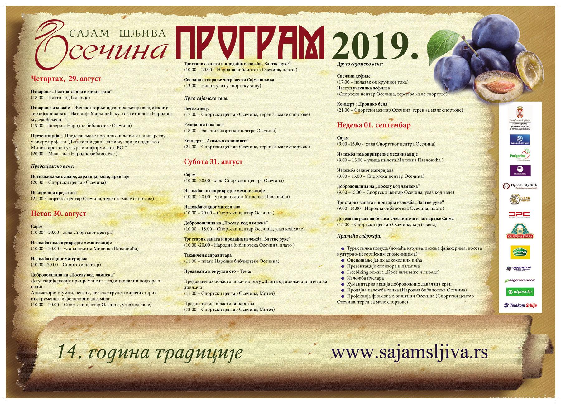 Od 29.avgusta do 01. septembra u opštini Osečina biće održan 14. Sajam šljiva Osečina – najveća manifestacija posvećena šljivi u čitavoj Srbiji, na kojoj će tradicionalne proizvode od šljiva predstaviti veliki broj učesnika, privrednika, poljoprivrednika iz Srbije i regiona.