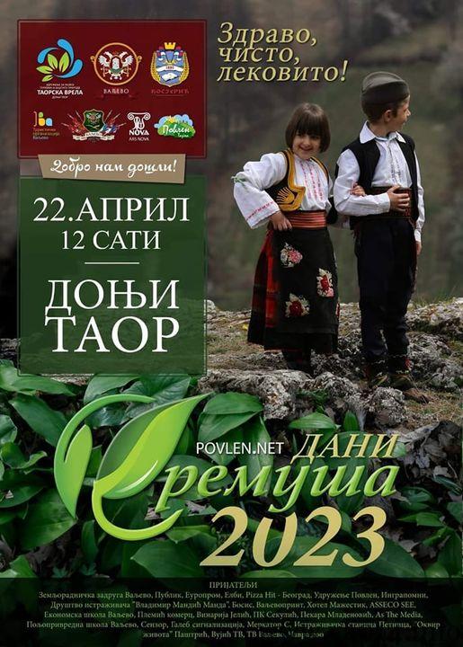 Manifestacija „Dani sremuša“ , deveti put za redom, biće održana u Donjem Taoru na Povlenu u subotu, 22.aprila 2023.godine. Organizatori ove celodnevne manifestacije u prirodi su Udruženje za razvoj turizma i zaštitu prirode „Taorska vrela“, Udruženje za negovanje kulture i tradicije valjevskog kraja, Turistička organizacija Valjevo i Klub ARS NOVA, uz podršku Grada Valjeva.Po rečima Vlade Dodovića iz Kluba ARS NOVA, ovogodišnja sremušijada je istog dana kada se u svetu obeležava Dan planete Zemlje, pa će i program biti u duhu ovog značajnog datuma u borbi za zdraviju životnu sredinu.