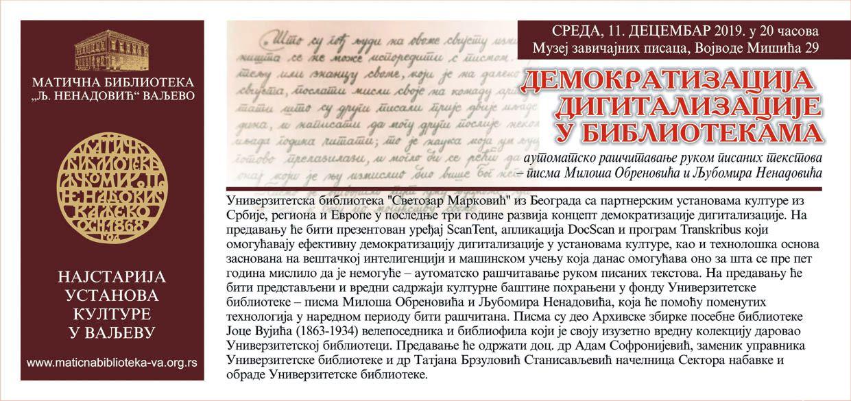 U sredu, 11. decembra u 20 časova, u Muzeju pisaca, biće predstavljen novi koncept demokratizacije digitalizacije, na primeru automatskog raščitavanja rukom pisanog teksta. Predavači su dr Adam Sofronijević i dr Tatjana Brzulović Stanisavljević.