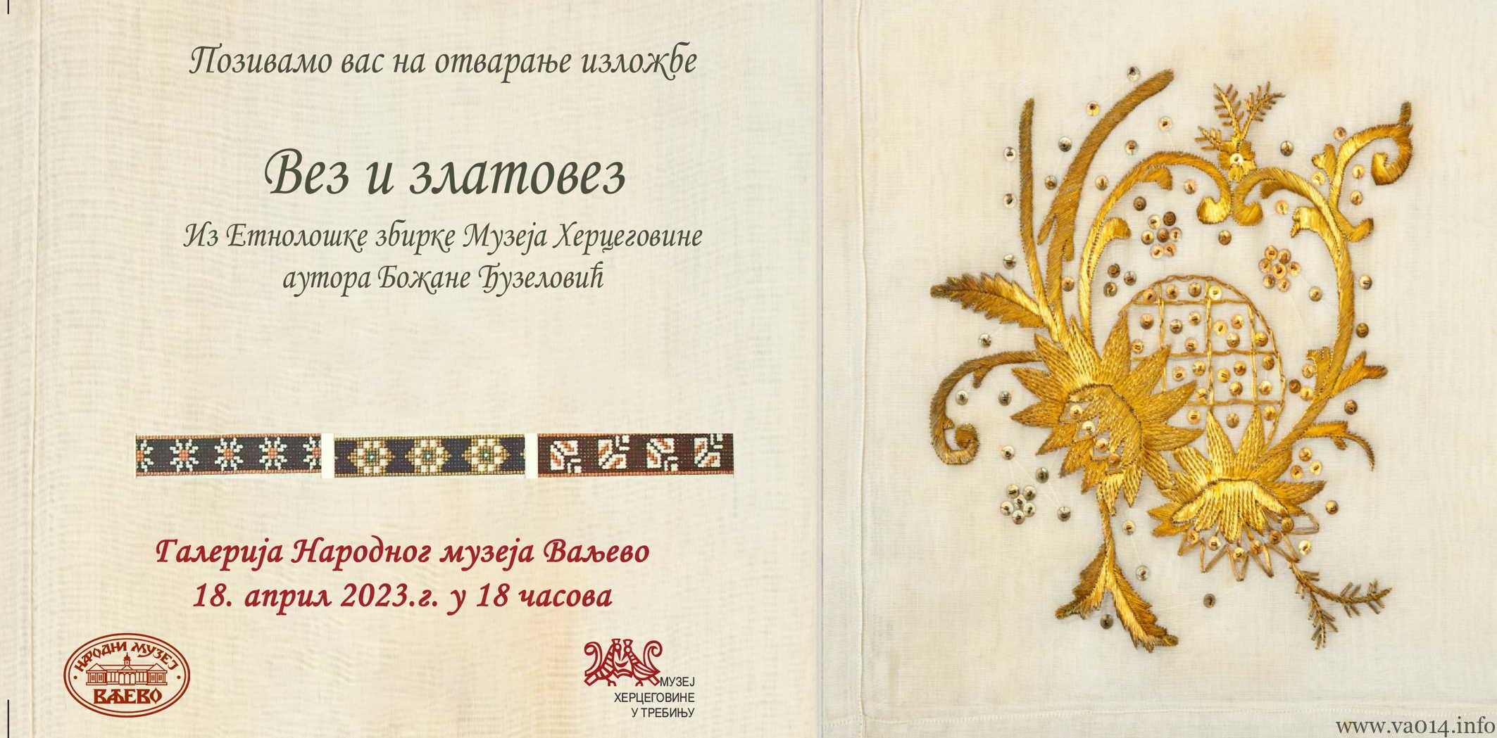 Izložba rukotvorina „Vez i zlatovez“ Etnološke zbirke Muzeja Hercegovine u Trebinju biće otvorena u Galeriji Narodnog muzeja u Valjevu. Na izložbi , čiji je autor etnolog Božana Đuzelović, biće predstavljeni eksponati veza i zlatoveza iz kućne radinosti seoskog i gradskog života s kraja 19. i prve polovine 20. veka.Svečano otvaranje izložbe je u utorak, 18. aprila u Galeriji Narodnog muzeja od 18 sati.