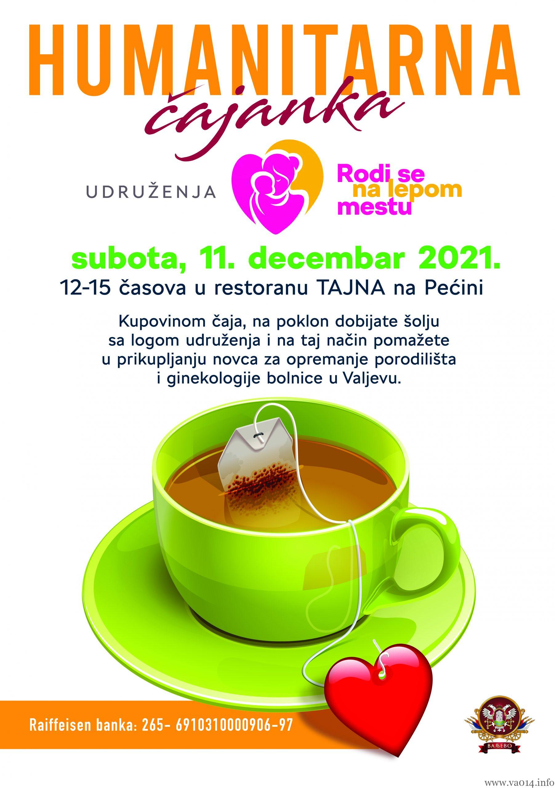 Humanitarna čajanka Udruženja „Rodi se na lepom mestu“ biće organizovana u subotu 11. decembra 2021. godine u restoranu „Tajna“ na Pećini od 12 do 15 časova.