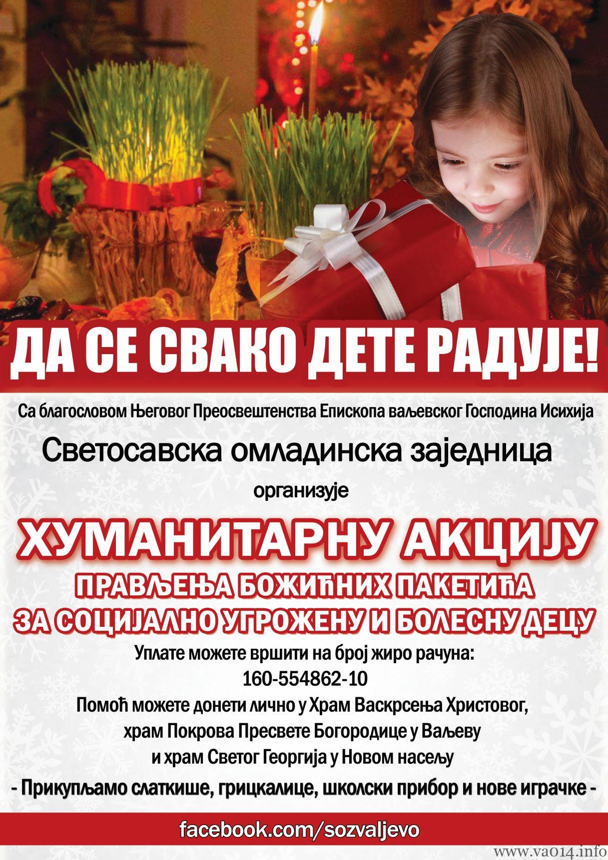 Svetosavska omladinska zajednica Eparhije valjevske i ove godine pokrenula humanitarnu akciju „Da se svako dete raduje“, koja podrazumeva pravljenje Božićnih paketića za socijalno ugroženu i bolesnu decu.