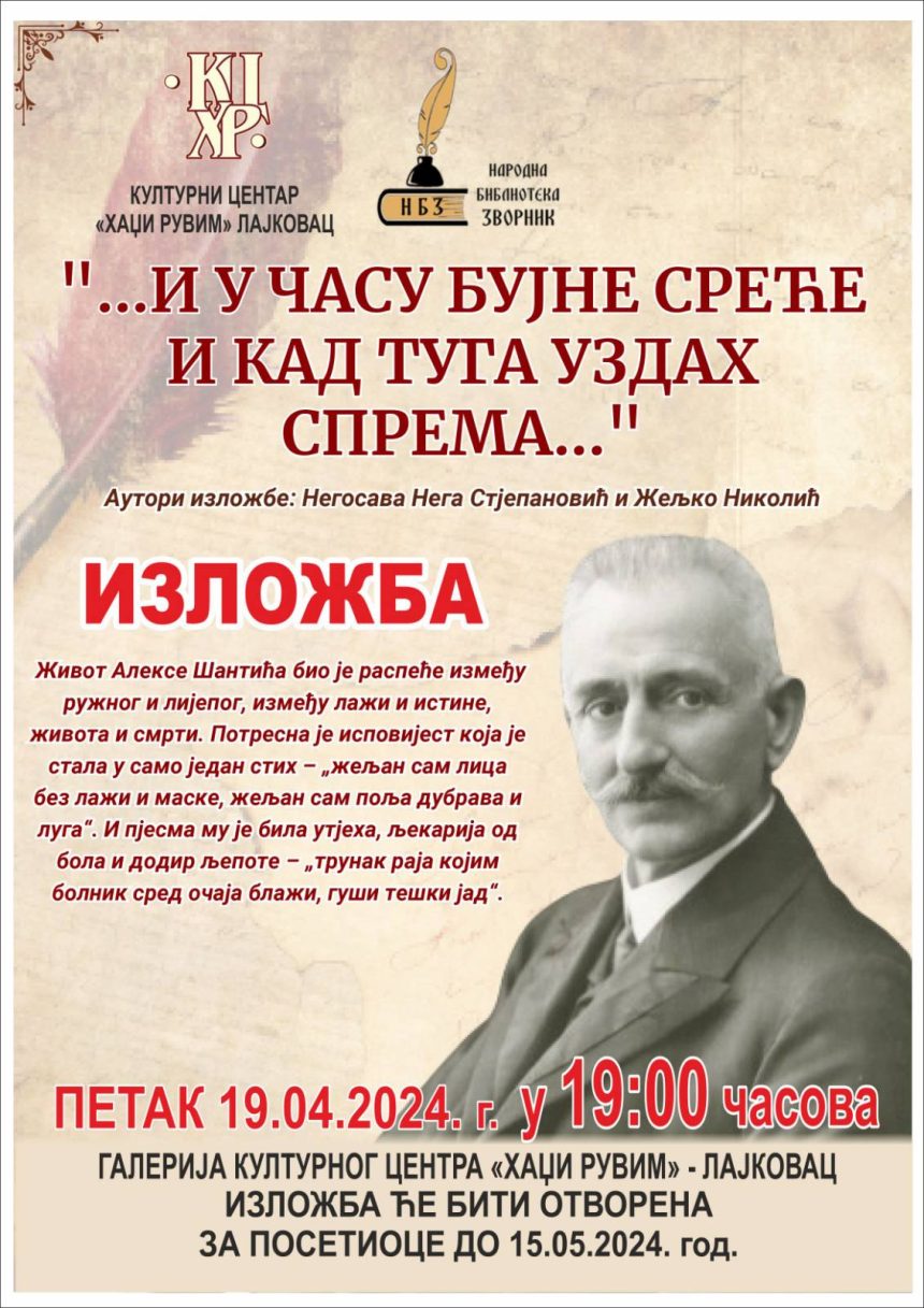 Izložba fotografija i tekstova o čuvenom srpskom pesniku Aleksi Šantiću Narodne biblioteke Zvornik biće otvorena u galeriji Kulturnog centra u petak 19. aprila u 19 časova. Trajaće do 15. maja.