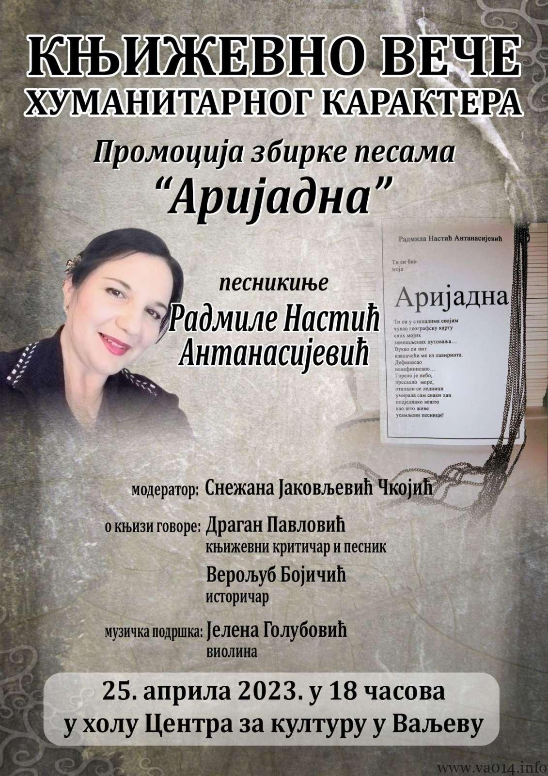 Promocija zbirke pesama „Arijadna“ pesnikinje Radmile Nastić Antanasijević, održaće se sutra, 25. aprila 2023. godine u holu Centra za kulturu Valjevo, sa početkom u 18 časova.
