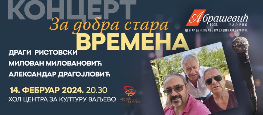 CZNTK „Abrašević“ u saradnji sa Centrom za kulturu, a uz podršku Grada Valjeva, organizuje koncert evergrin muzike. Na neke nezaboravne melodije zabavne muzike podsetiće nas Dimče Ristovski ( vokal i bas gitara ), Milovan Milovanović ( gitara ) i Aleksandar Dragojlović ( harmonika). U ovom svojevrsnom vremeplovu naći će svoje mesto poznate pesme Dragana Stojnića, Zdravka Čolića, Kiće Slabinca, Lea Martina, Bobe Stefanovića, Mikija Jevremovića… Koncert će biti upriličen u sredu, 14. februara sa početkom u 20:30 sati u Art holu Centra za kulturu. Ulaz je slobodan.
