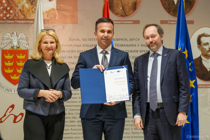 Predsednik opštine Mionica Boban Janković prisustvovao je svečanoj dodeli sertifikata za projekte poslovne infrastukture koje finansira Evropska unija, a koje su predstavnicima 20 gradova i opština uručili ministarka za evropske integracije Tanja Miščević i ambasador Evropske unije u Srbiji Emanuele Žiofre. Opštini Mionica odobrena su sredstva u iznosu od 52 miliona dinara za kompletnu rekonstrukciju izvorišta Orlovac u Osečenici i zamenu 900 metara azbestnih cevi. Ukupna vrednost projekta je blizu 58 miliona dinara, a lokalna samouprava izdvojila je oko 6 miliona dinara.