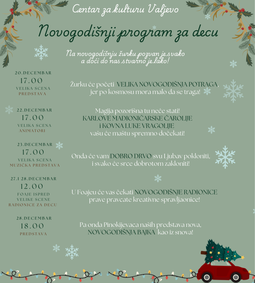 Program počinje 20. decembra u 17 časova predstavom Velika novogodišnja potraga. Dva dana kasnije, 22. decembra u istom terminu, decu očekuju animatori i magični program uz Karlove mađioničarske čarolije i Kovna Luke vragolije. Muzička predstava Dobro drvo biće izvedena 23. decembra od 17 časova.