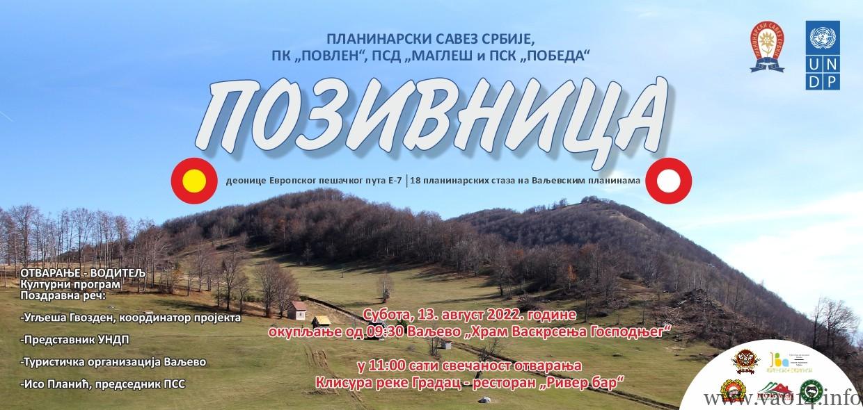 Komisija za planinarske terene PSS i planinarski klubovi PK Povlen, PSD Magleš i PSK Pobeda pozivaju vas na manifestaciju otvaranja planinarskih i pešačkih staza u Valjevu, nakon završetka projekta „Uređenje planinarskih i pešačkih staza na Valjevskim planinama“.