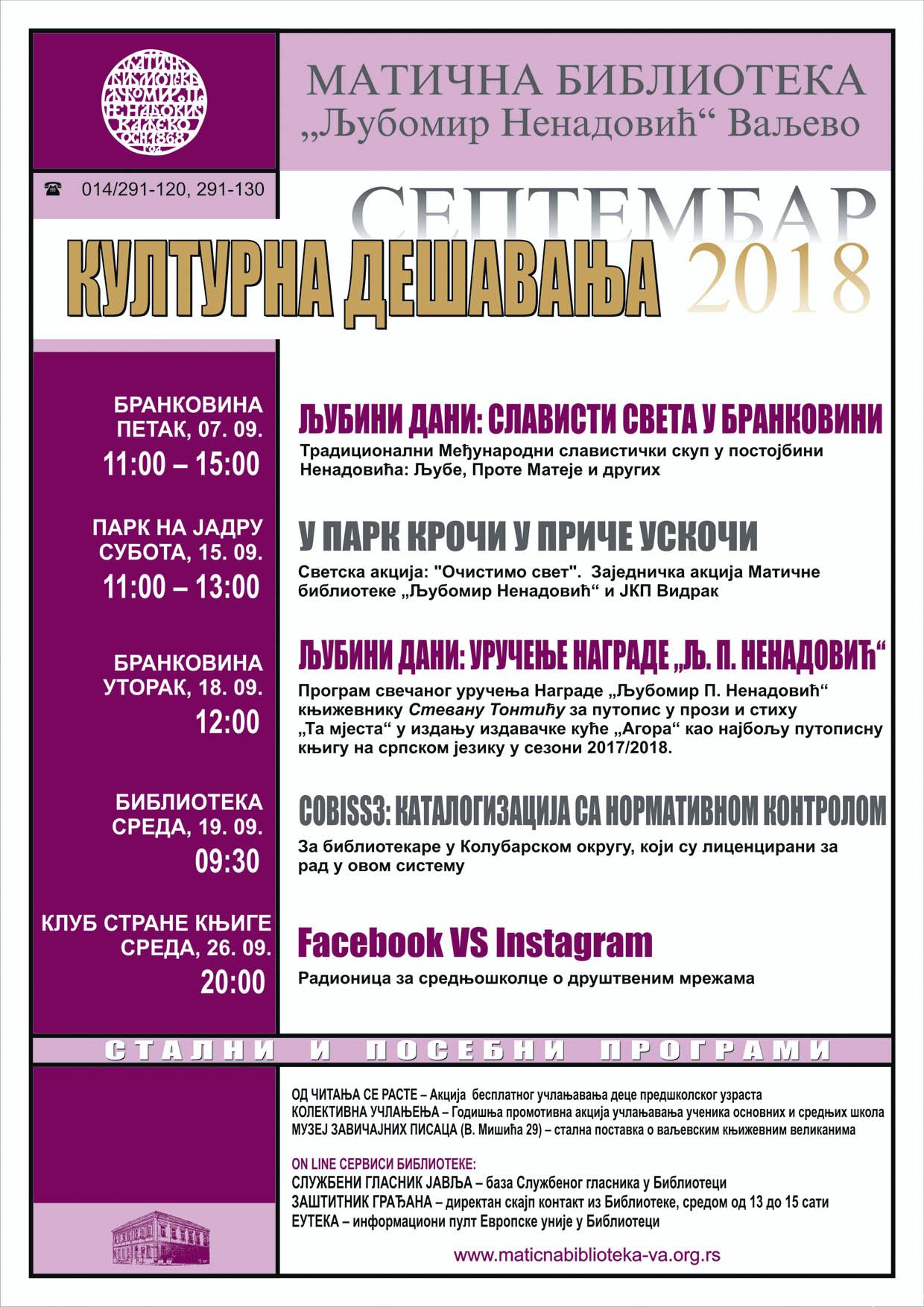 Matična biblioteka „Ljubomir Nenadović“,Valjevo i ove godine organizuje program u sezoni jesen-zima 2018.god. Programski sadržaji su namenjeni za sve uzraste od kreativnih radionica, kulturnih i obrazovnih programa, debate, predavanja, performanse i akcije.