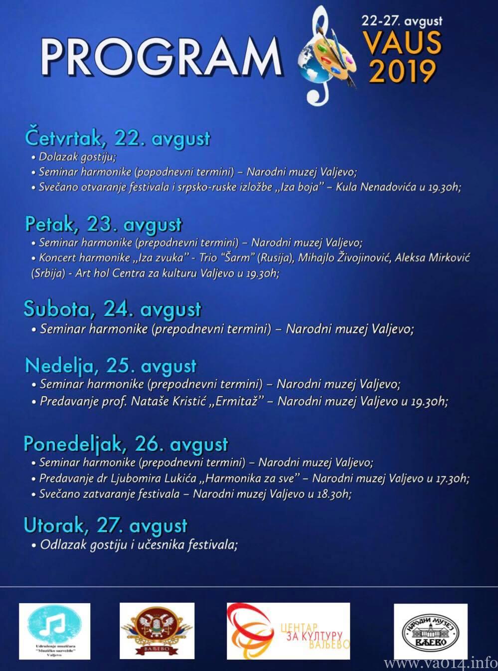 Prvi internacionalni umetnički festival VAUS 2019 koji će se održati od 22 do 27. avgusta 2019.godine. Svečano otvaranje festivala i srpsko-ruske izložbe “ IZA BOJA “ je u četvrtak, 22. avgusta 2019. godine u 19: 30 časova u Kuli Nenadovića.