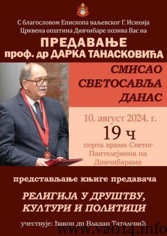 U subotu, 10.avgusta akademik prof.dr Darko Tanasković govoriće na temu „Smisao svetosavlja danas“ u porti divčibarskog hrama od 19 sati. Tom prilikom biće predstavljena i njegova knjiga „Religija u društvu, kulturi i politici“ u izdanju „Duhovne reči“, nove izdavačke kuće Arhiepiskopije beogradsko- karlovačke. O knjizi, u ime izdavača, govoriće đakon dr Vladan Tatalović i autor. U knjizi su sabrane duhovne misli i eseji o veri, o pravoslavlju, o ulozi crkve u društvu, odnosima sa rimokatoličkom crkvom, jer je profesor Tanasković bio i u ambasadorskoj službi u Vatikanu.Crkva na Divčibarama je izgrađena 2001.godine po projektu valjevskog arhitekte Tihomira Dražića, a duborezni ikonostas je rad Ljubana Marića iz Bogatića. U crkvenim tronovima su pohranjene čestice moštiju svetog Pantelejmona, svete Petke i svetog vladike Nikolaja Lelićkog.