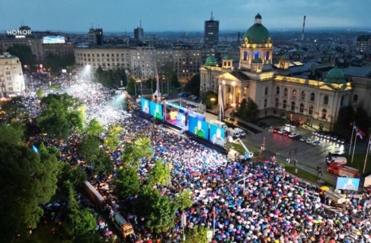 – Pozivamo sve građane Srbije da 26. maja, dan uoči velikih i važnih odluka za Srbiju, pozovemo ljude u odbranu slobodarskih, demokratskih vrednosti naše Srbije da dođu na najveći skup ikada održan u Srbiji. Održaćemo ga ispred Narodne skupštine ili na Trgu republike u Beogradu 26. u poslepodnevnim satima. Pozivamo sve ljude koji žele dobro Srbiji, koji žele da sačuvamo Srbiju, da je odbranimo od onih koji bi da je uruše i da je unište po svaku cenu i da pokažemo na miran, dostojanstven, ponosan i demokratski način da Srbiju niko ne može da oduzme njenim građanima. Živela Srbija, videćemo se 26. maja na platou ispred Narodne skupštine – rekao je Vučić.