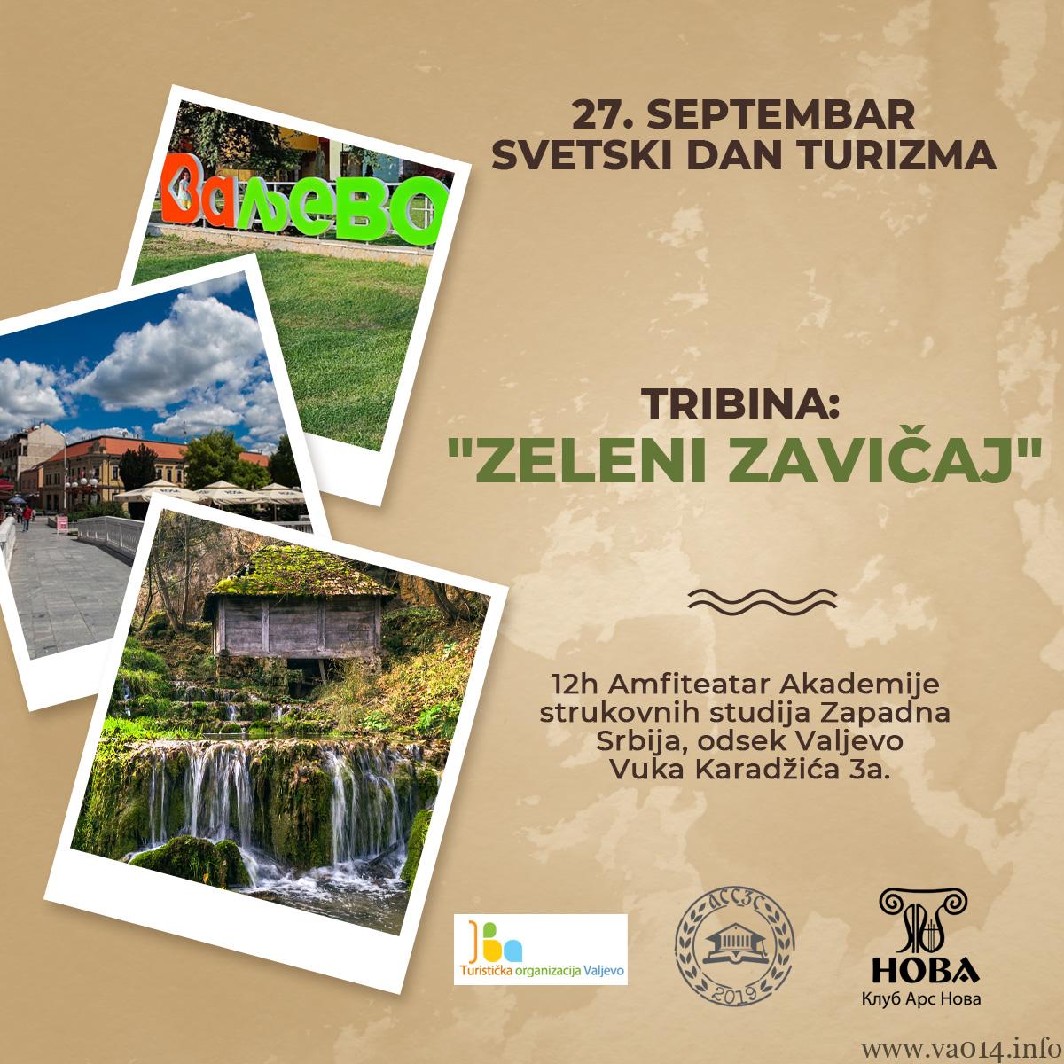 Povodom obeležavanja Svetskog dana turizma u Amfiteatru Akademije strukovnih studija Zapadna Srbija odsek Valjevo, biće održana tribina pod nazivom „Zeleni zavičaj“ uz podršku Grada Valjeva, Turističke organizacije Valjevo i Kluba Ars Nova.