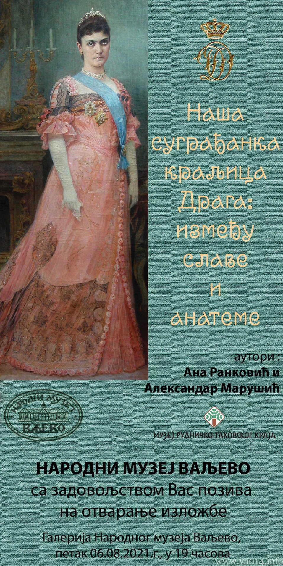 U Narodnom muzeju Valjevo tokom trajanja Tešnjarskih večeri u petak, 6. avgust 2021. godine u 19 časova svečano će biti otvorena izložba Muzeja Rudničko- takovskog kraja pod nazivom “NAŠA SUGRAĐANKA KRALJICA DRAGA: IZMEĐU SLAVE I ANATEME“