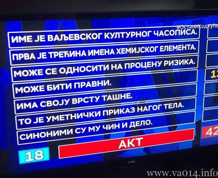 TV slagalica je kviz koji se emituje na Radio-televiziji Srbije kao kviz sa najdužim stažom na Balkanu. U večerašnjem izdanju TV slagalice (6. maj 2020) u rubrici „korak po korak“ prva asocijacija je glasila: IME JE VALJEVSKOG KULTURNOG ČASOPISA, a krajnji odgovor je bio „Akt“.